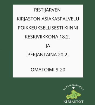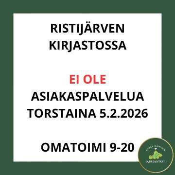 RISTIJÄRVEN KIRJASTOSSA ei ole asiakaspalvelua tänään torstaina 5.2. sairaustapauksen vuoksi. Huovisilta järjestetään kuitenkin edelleen tänään...