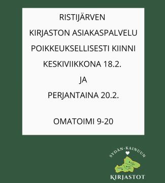 RISTIJÄRVEN KIRJASTOSSA ei poikkeuksellisesti ole ensi viikon keskiviikkona (18.2.) ja perjantaina (20.2.) asiakaspalvelua. Voit käyttää näinä...