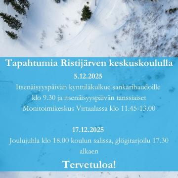 Ristijärven keskuskoululla 5.12.2025 klo 9.30 Itsenäisyyspäivän kynttiläkulkue sankarihaudoille ja 11.45-13.00 Itsenäisyyspäivän tanssiaiset...