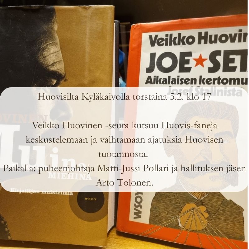 Veikko Huovinen -seura kutsuu Huovis-faneja keskustelemaan ja vaihtamaan ajatuksia Huovisen tuotannosta.