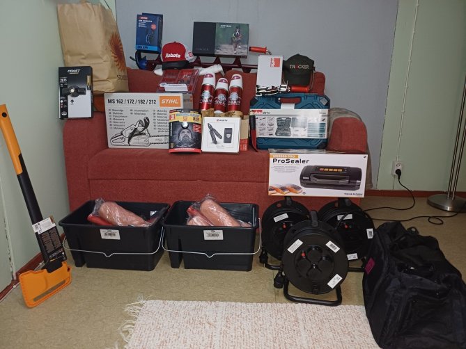 "Pääpalakinto tulloo SPJ:ltä. Muut palakinnot on tullu lahjotuksena - minä oon kerjänny niitä ympäri Suomea", kertoo Risto Karjalainen. "Meillä on hyvät palakinnot: noin 700 euroa maksava tutka on pääpalakinto, ja jokkaenen koiranomistaja saa saman verran palakintoja kuin on osanottomaksu."