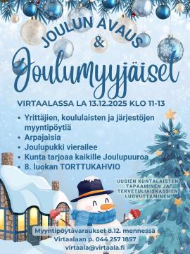 Joulun avaus ja joulumyyjäiset Monitoimikeskus Virtaalassa lauantaina 13.12 klo 11-13 🥰 Mukana paljon myyjiä, koululaisten, järjestöjen ja Yrittäjien...