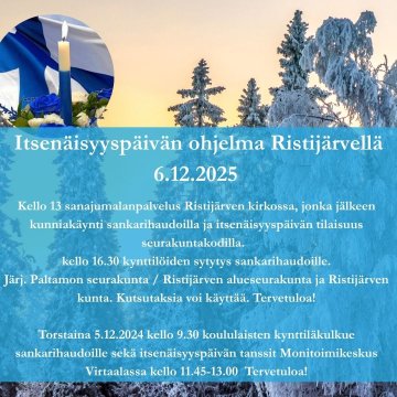 Ristijärven keskuskoululla 5.12.2025 klo 9.30 Itsenäisyyspäivän kynttiläkulkue sankarihaudoille ja 11.45-13.00 Itsenäisyyspäivän tanssiaiset...