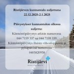 Ristijärven kunnantalo suljettuna 22.12.2025-2.1.2025 Päivystykset kunnantalon ollessa suljettu: Kiinteistöpäivystys arkisin numerossa 0447159359 tai...